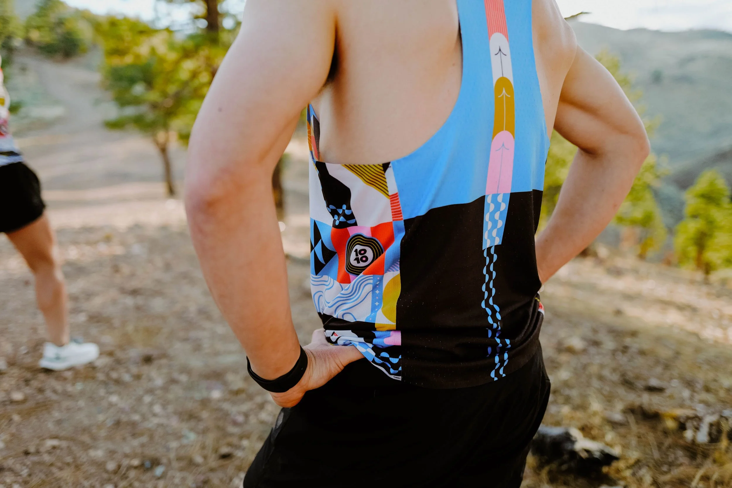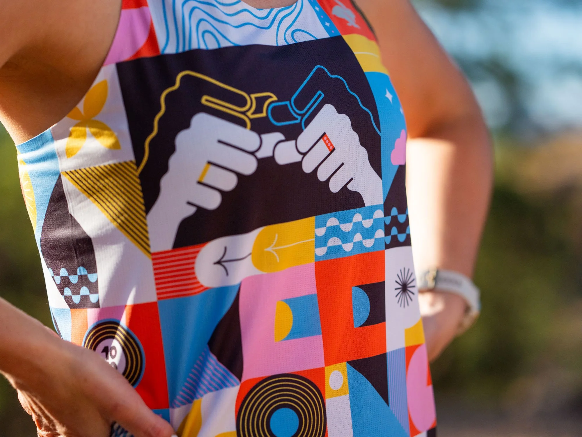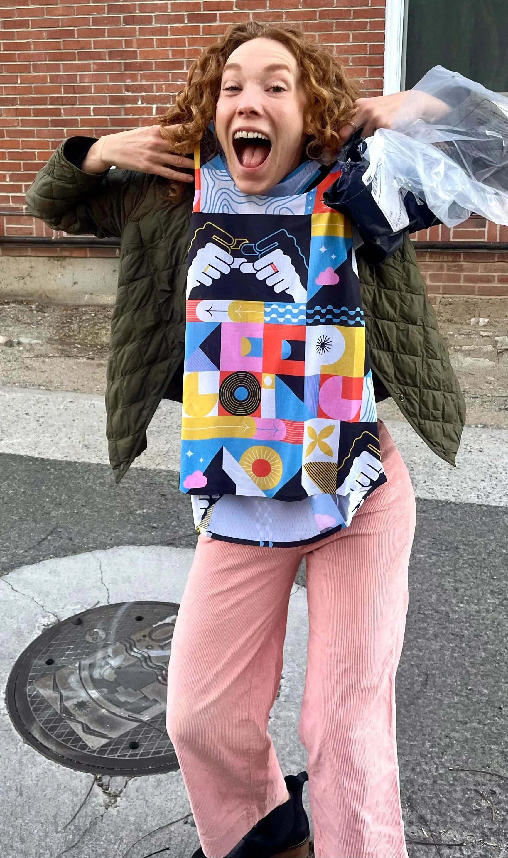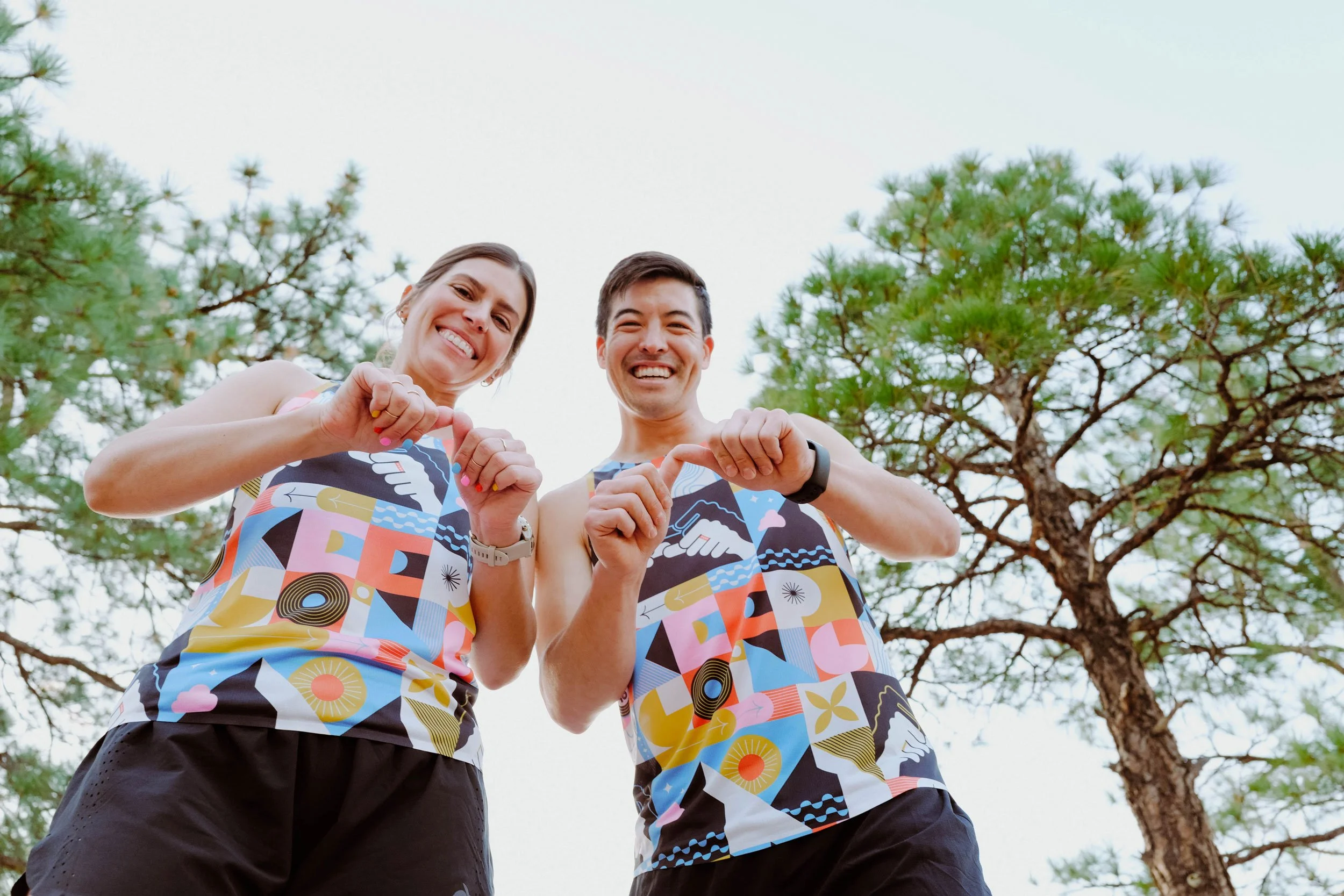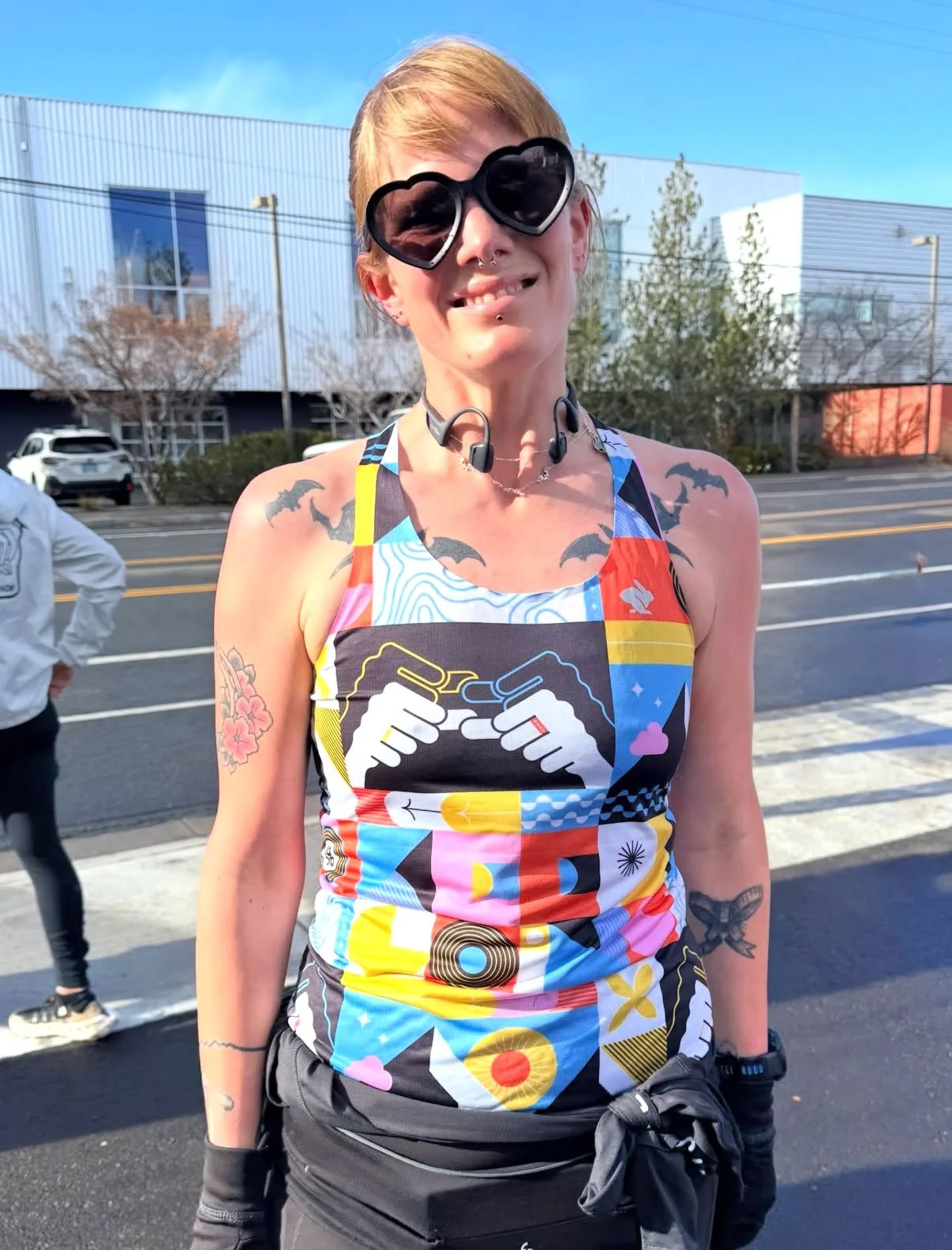 Remy’s design is rooted in resilience. Born with profound hearing loss, Remy turned to running as both a personal journey and a source of connection. Her singlet features “Keep Going” rendered in American Sign Language (ASL), a bold reminder that persistence and community can carry us further than we ever imagined.