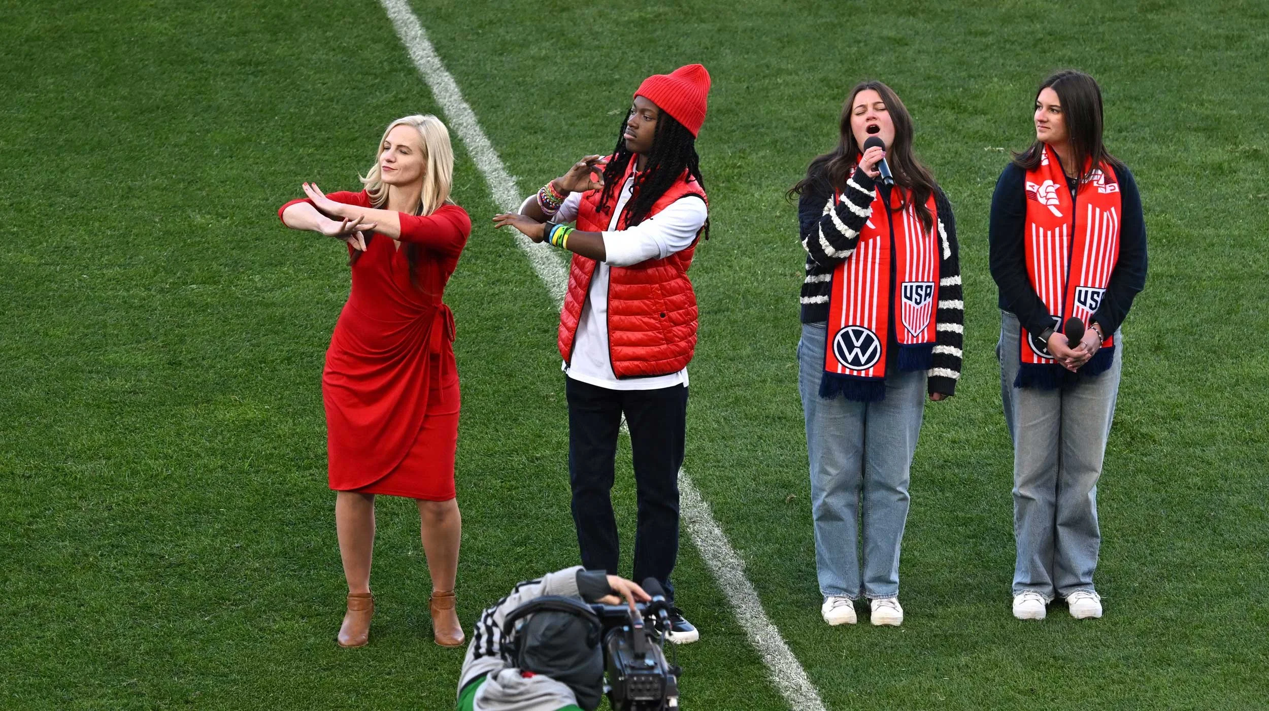 ASL interpreters with singers for the National Anthem wearing UNITY scarves