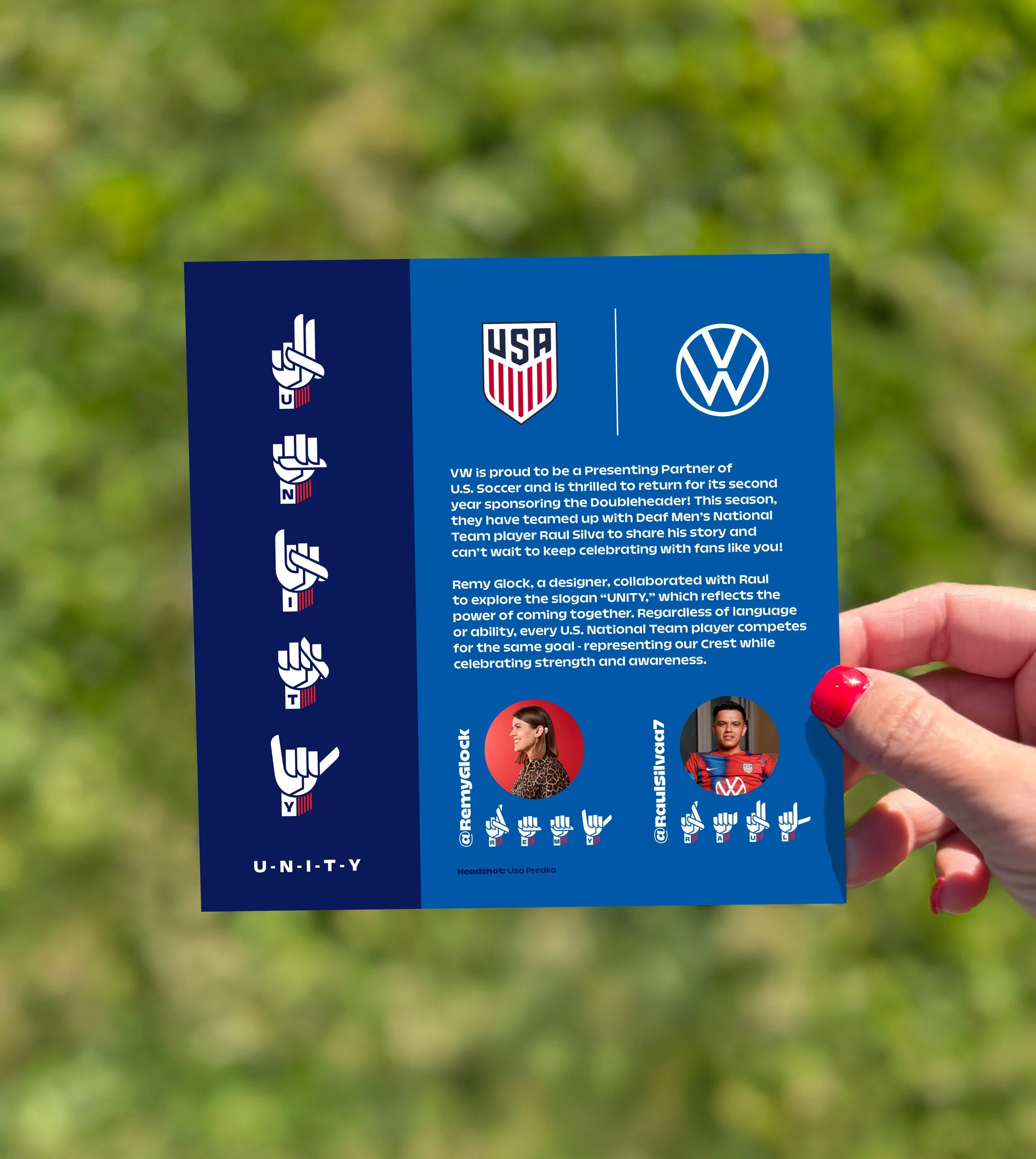Unity is more than a slogan, it’s a statement. Created in collaboration with Raul Silva who is on the Deaf MNT. This project builds on CHAMPS one year later, spotlighting the power of coming together. Across languages and abilities, every player competes for the same crest. Debuted during a historic doubleheader, UNITY amplifies the strength and visibility of the Deaf team because together, we play as one.